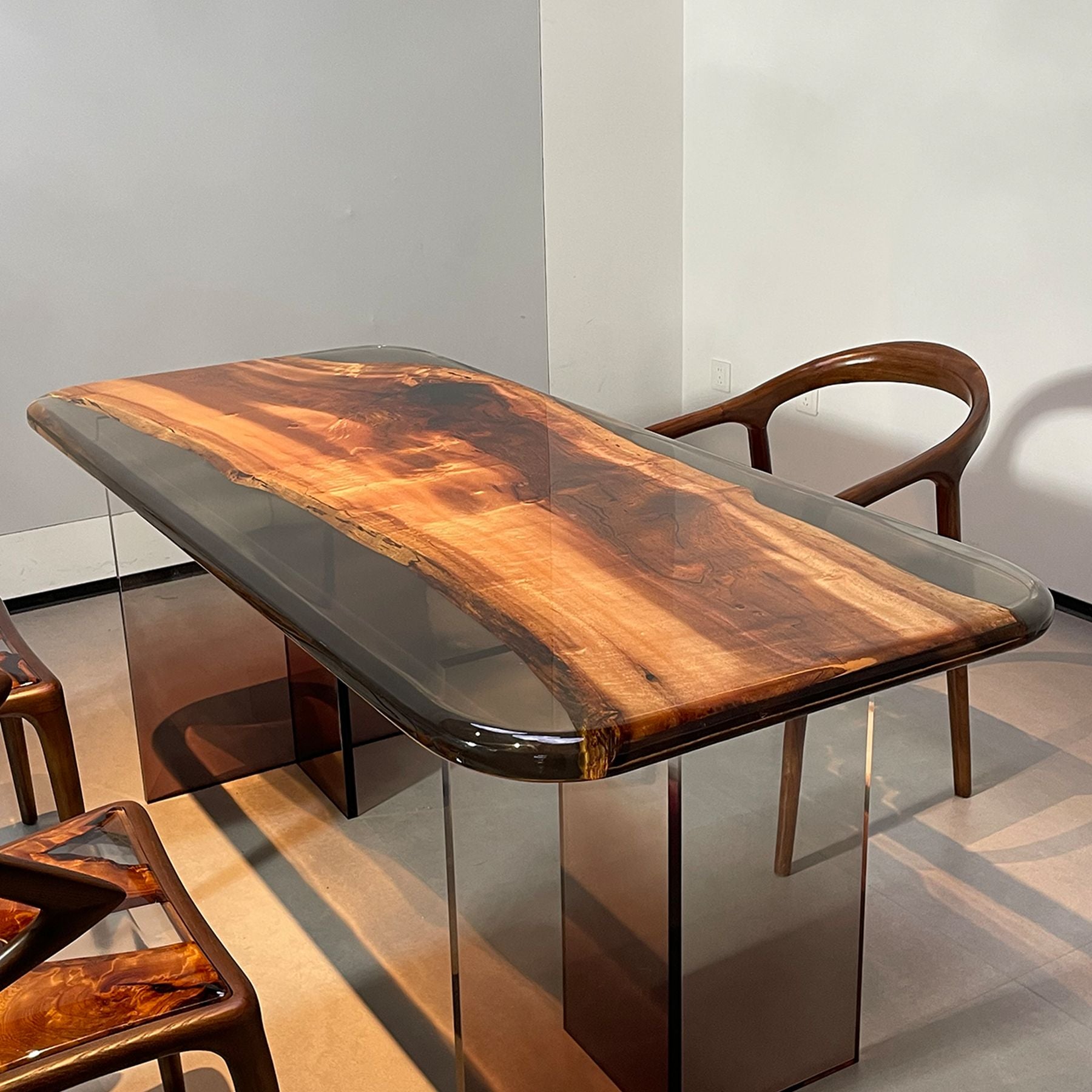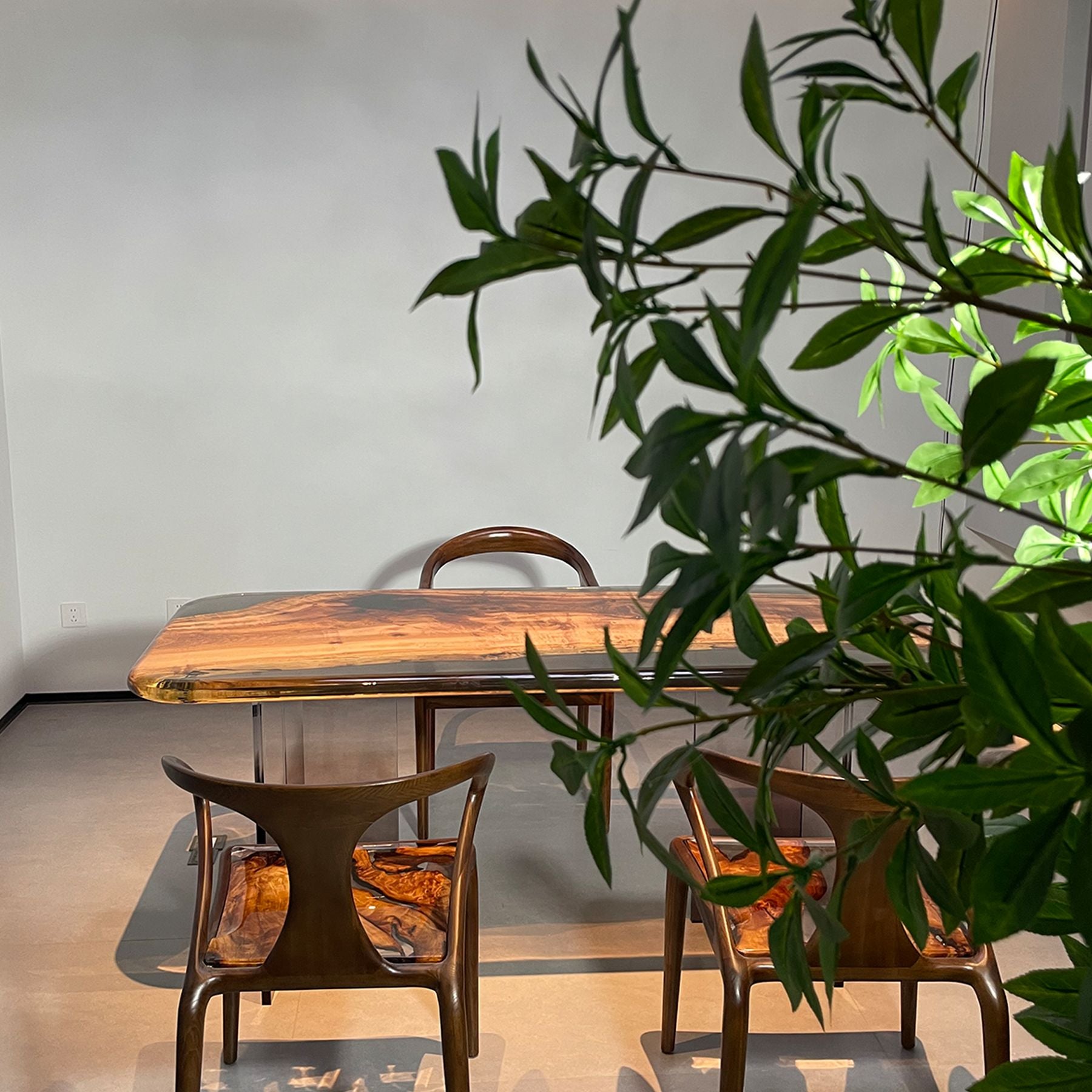 This stunning resin table is crafted from premium golden camphor wood, boasting a size of 70.88”?31.6”?2” . The natural wood grain patterns are beautifully showcased under a smooth layer of clear resin, creating a glossy and durable surface. The tabletop features a single, expansive slab of wood, its intricate grain patterns and rich, warm hues perfectly preserved under a glossy layer of resin.?
