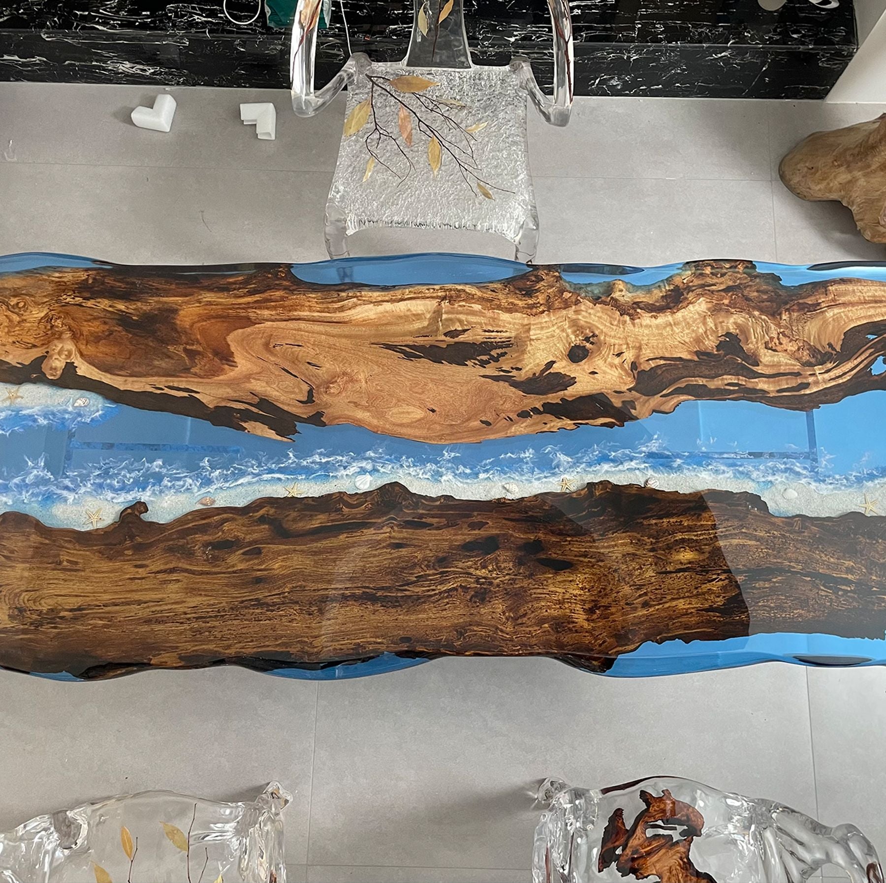 This remarkable resin table is crafted from high-quality golden camphor wood, measuring 78.74”?29.53”?2”. The tabletop showcases a breathtaking ocean-inspired design, where the natural wood grain seamlessly blends with the deep blue resin, mimicking the waves crashing against the shore.?