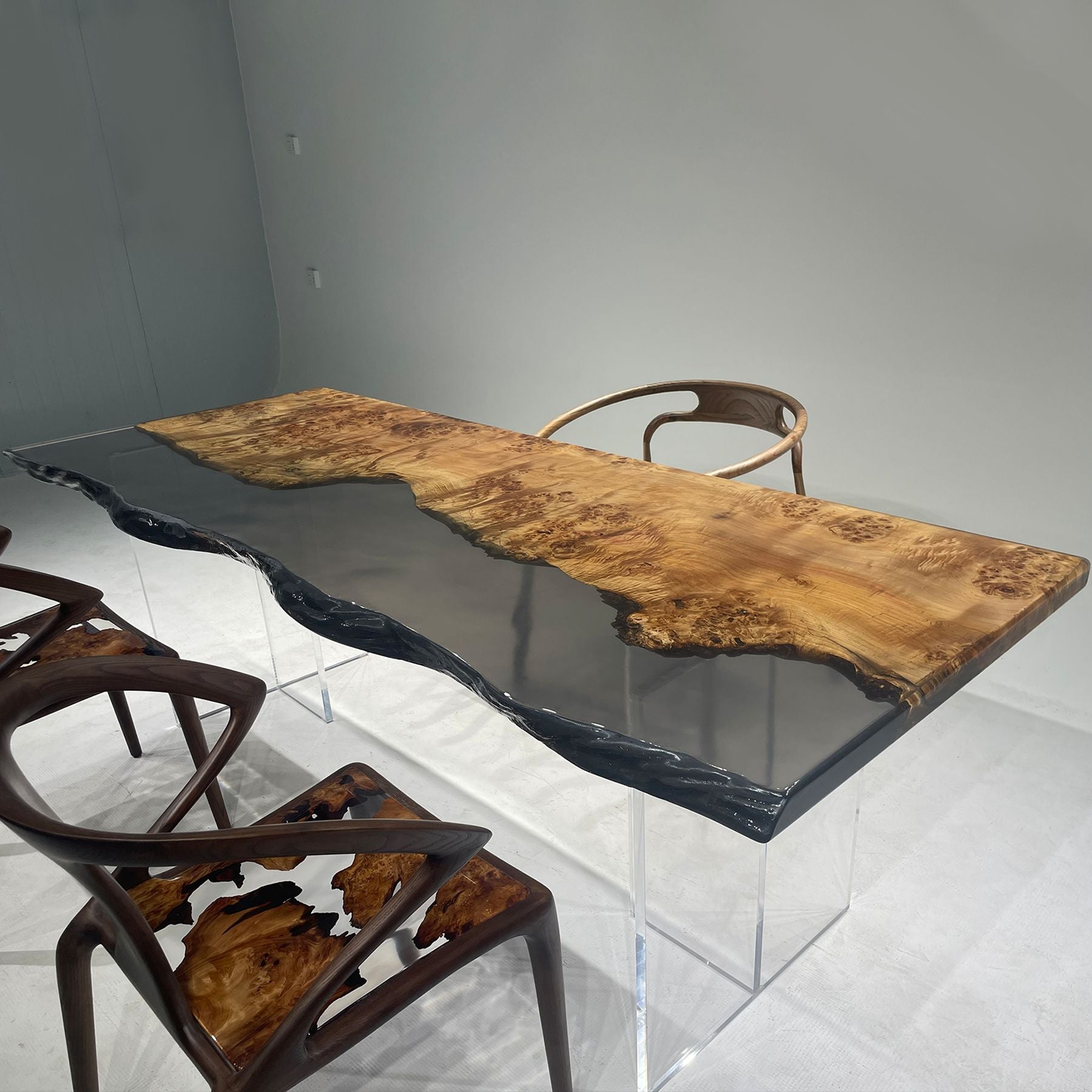 This remarkable resin table, measuring 86.61 inches in length, 35.43 inches in width, and 2 inches in height, features a live – edge design crafted from beautiful poplar wood. The natural, swirling grain patterns of the poplar create a striking contrast with the smooth, glossy resin surface. Complemented by matching chairs that showcase the same wood – resin aesthetic, it is a perfect centerpiece for any modern or rustic – themed space, seamlessly blending natural charm with contemporary elegance.