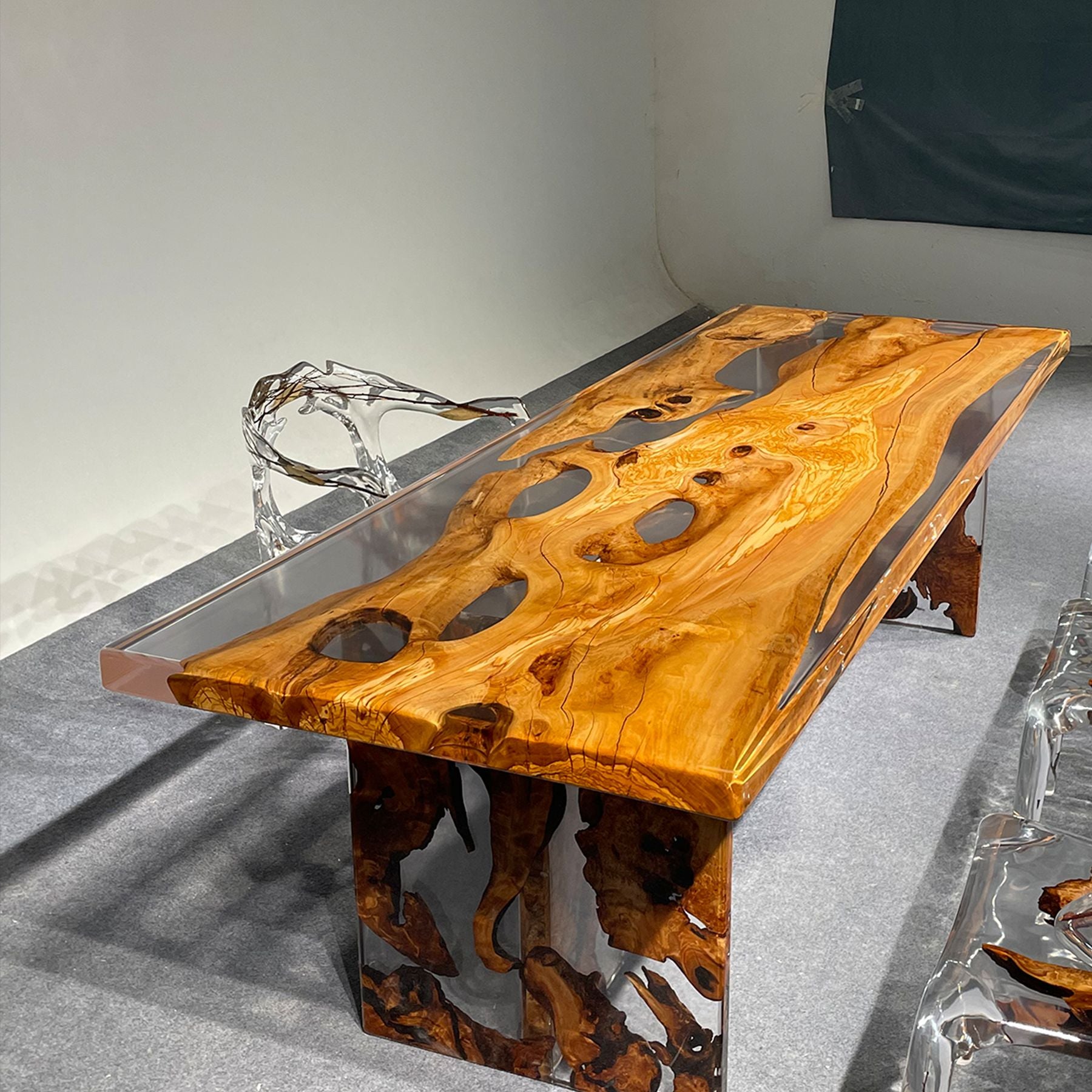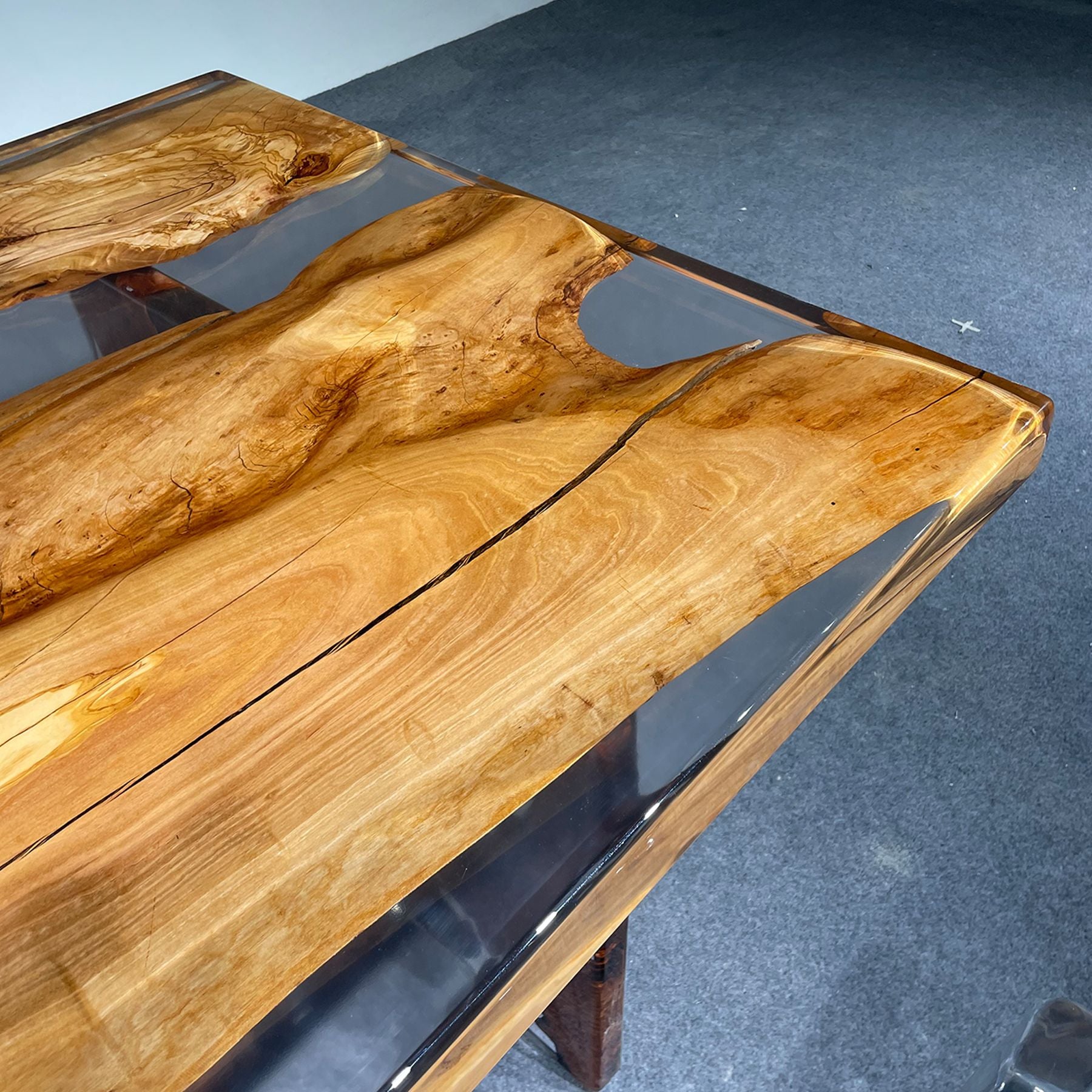 Olive Wood and Resin Table with Clear Resin Measuring 137.8″ x 39.37″ x 4.33″